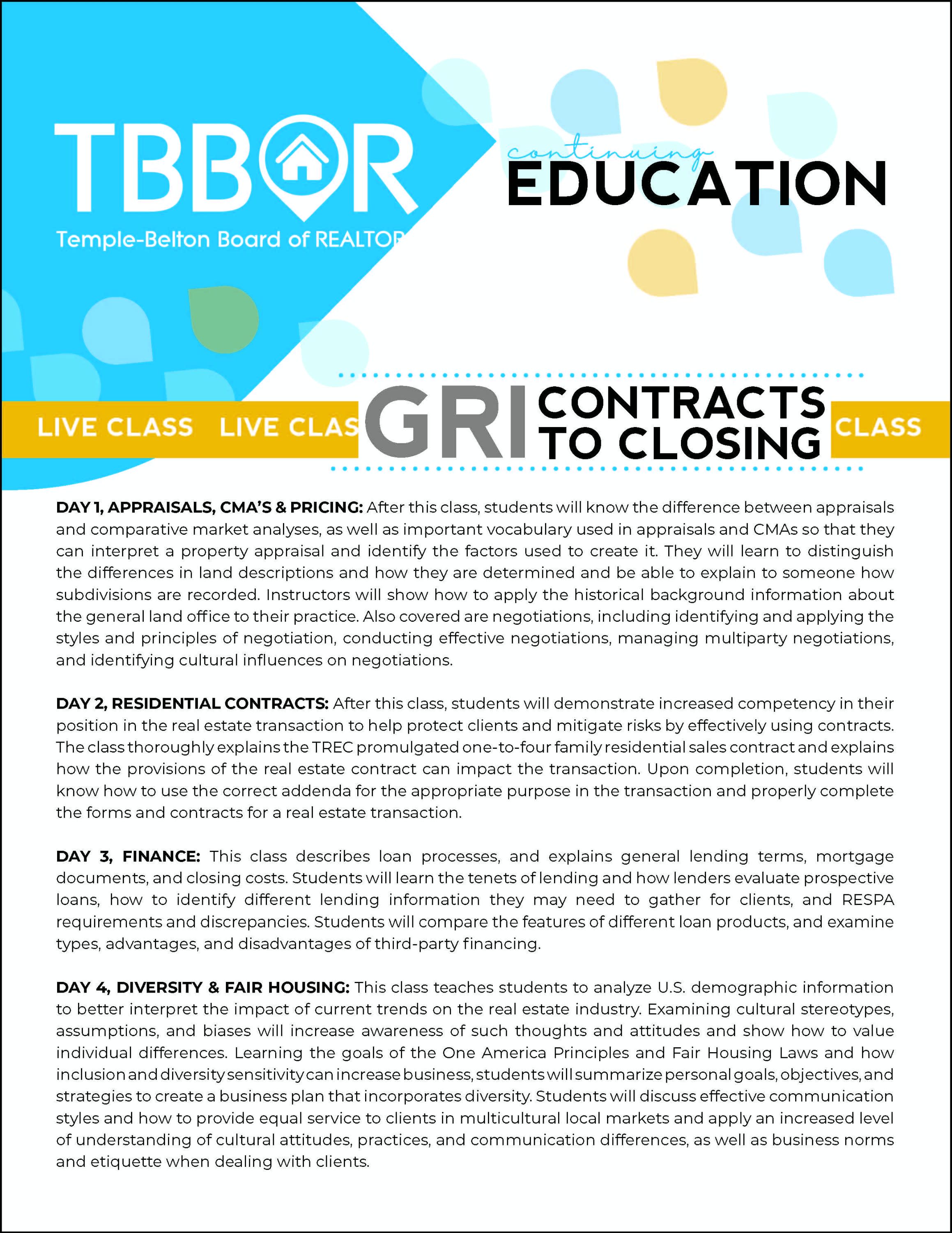 The GRI designation is a powerful tool to attract and build new business. You'll increase your skill level across the entire landscape of real estate with in-depth training in legal and regulatory issues, technology, professional standards, and the sales process. In this 30-hour section - GRI: Contracts to Closing - topics will include lending essentials, residential contracts, appraisals, surveys, negotiations, fair housing, and diversity.