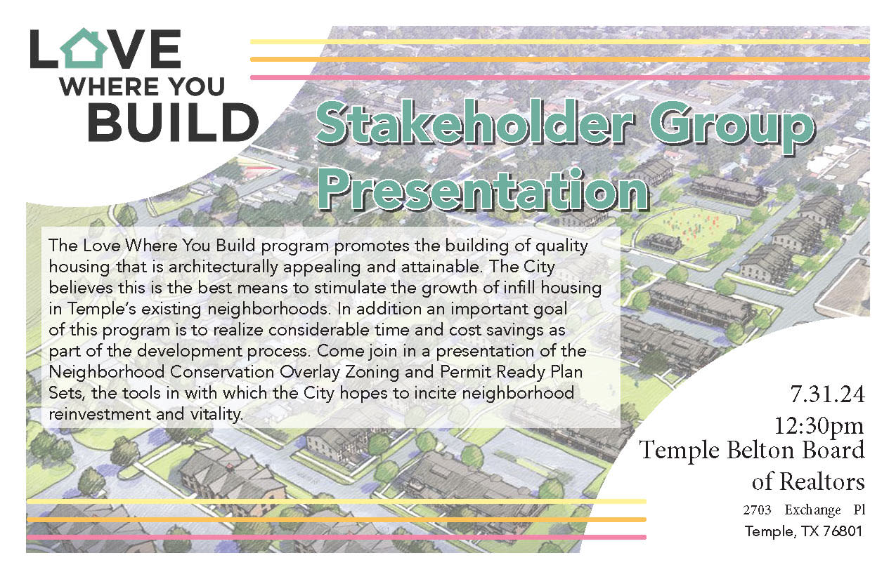 The City of Temple's Planning Department will be presenting their Love Where You Build Program, which promotes the building of quality housing that is architecturally appealing and attainable. They will be asking our members for feedback during this meeting.