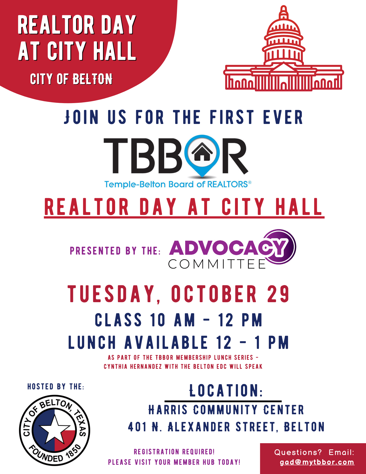 **PLEASE NOTE: If you register for the REALTOR® Day at City Hall - City of Belton Day you are automatically registered for the Membership Luncheon Series - EDC talk with Cynthia Hernandez at noon. You do not need to register for both!**