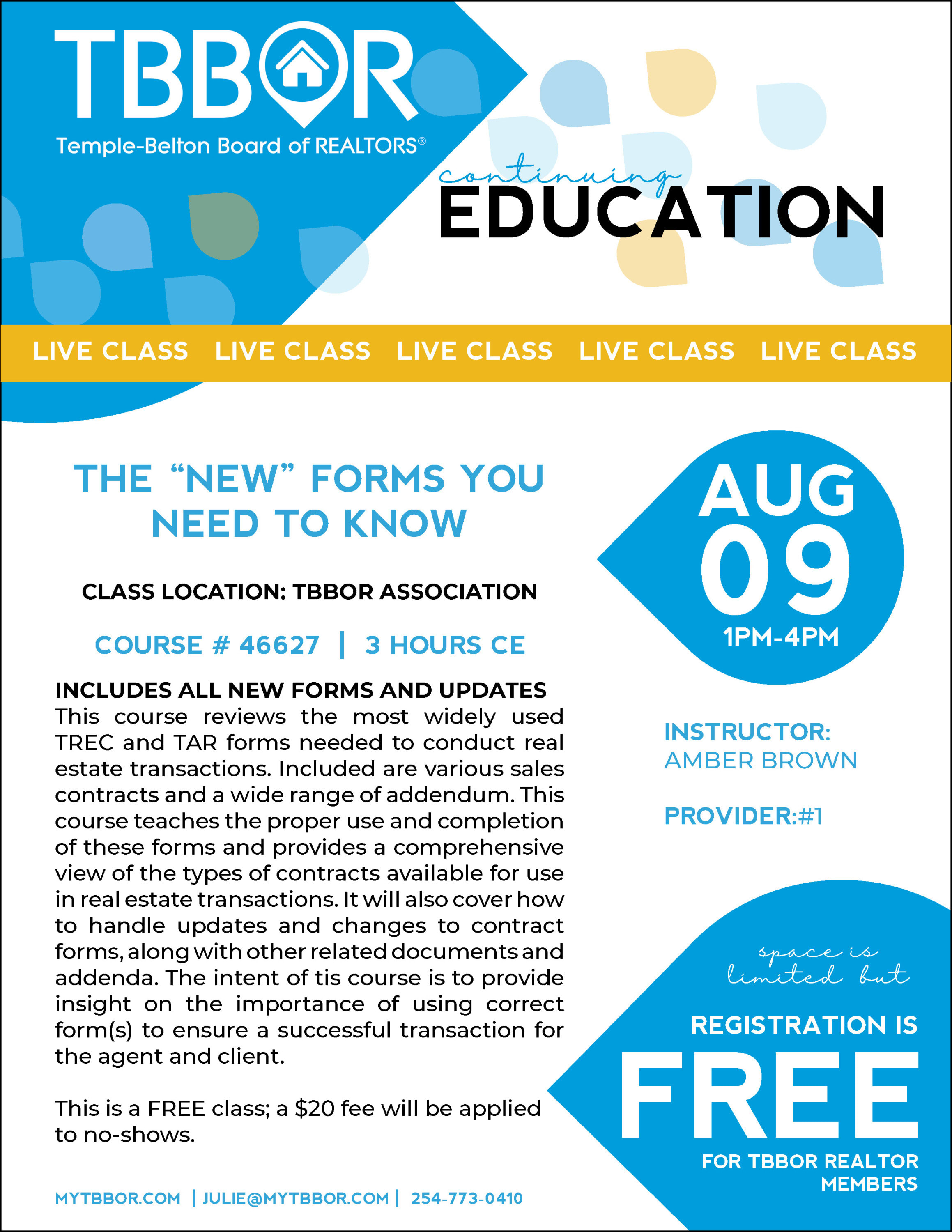 This course reviews the most widely used TREC and TAR forms needed to conduct real estate transactions. Included are various sales contracts and a wide range of addendum. This course teaches the proper use and completion of these forms and provides a comprehensive view of the types of contracts available for use in real estate transactions. It will also cover how to handle updates and changes to contract forms, along with other related documents and addenda. The intent of this course is to provide insight on the importance of using correct form(s) to ensure a successful transaction for the agent and client.