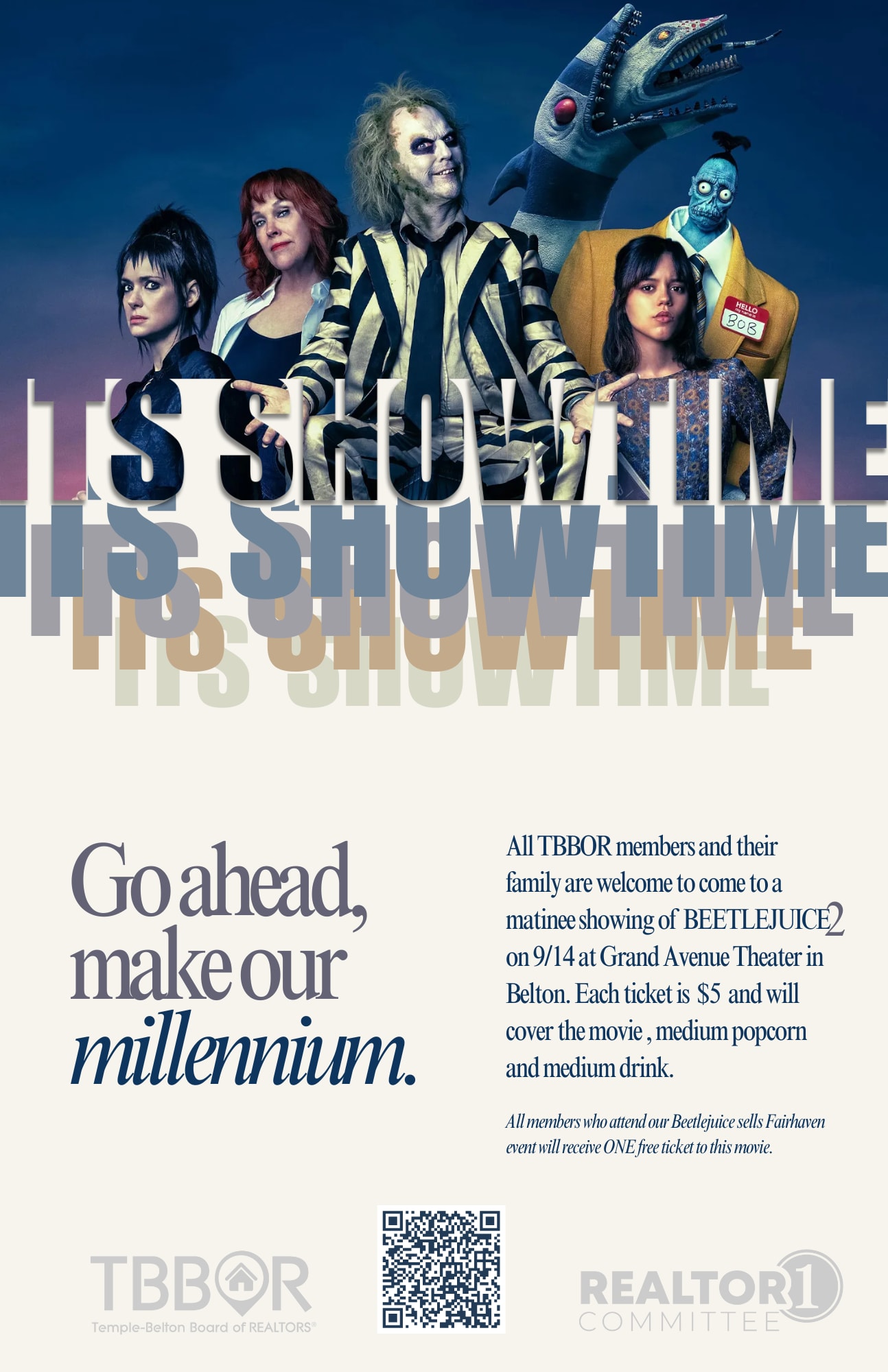 Go ahead, make our millennium and join TBBOR's REALTOR1 Committee as they host Member Movie Matinee Day! All TBBOR members and their family are welcome to come - each $5 purchase will cover a movie ticket, medium popcorn and medium drink. (Movie starts at 2pm, come early to get checked in)