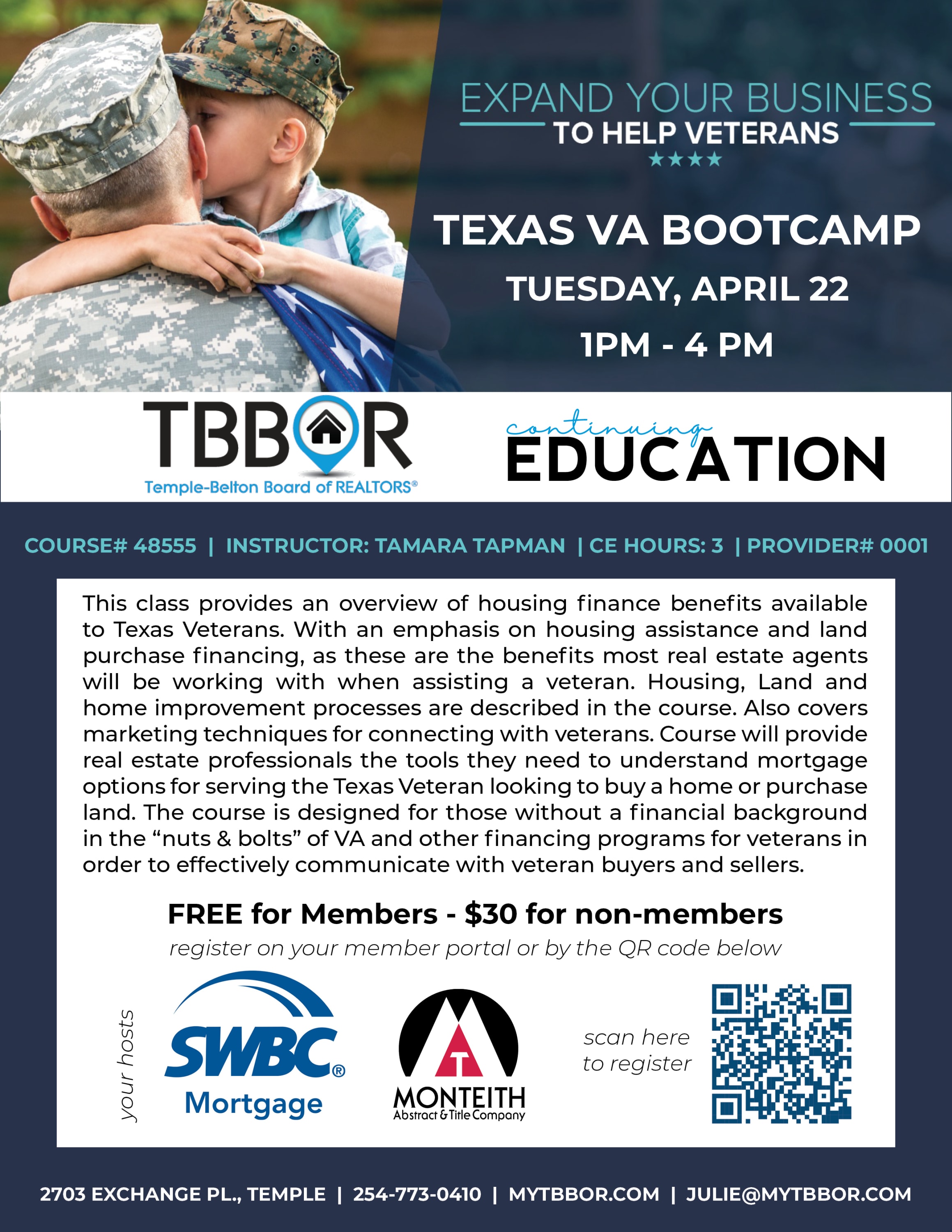 This class provides an overview of housing finance benefits available to Texas Veterans. With an emphasis on housing assistance and land purchase financing, as these are the benefits most real estate agents will be working with when assisting a veteran. Housing, Land and home improvement processes are described in the course. Also covers marketing techniques for connecting with veterans. Course will provide real estate professionals the tools they need to understand mortgage options for serving the Texas Veteran looking to buy a home or purchase land. The course is designed for those without a financial background in the “nuts & bolts” of VA and other financing programs for veterans in order to effectively communicate with veteran buyers and sellers.