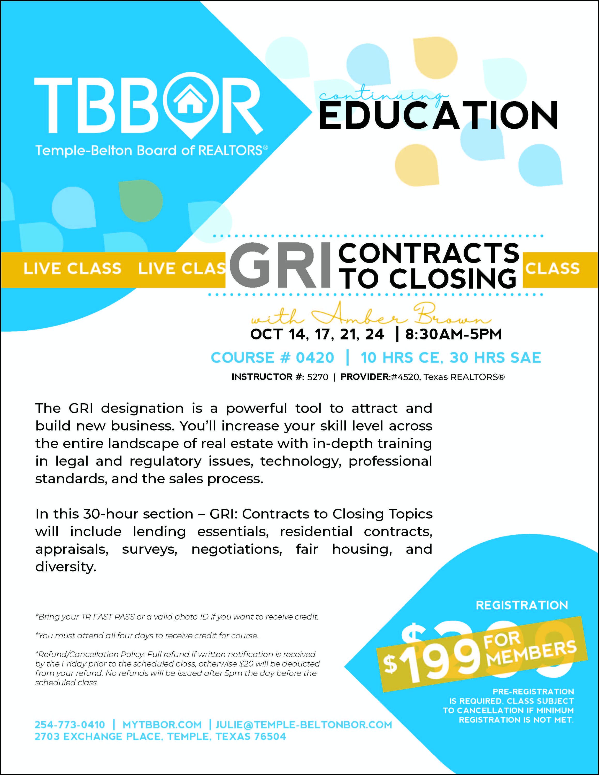 In this 30-hour section - GRI: Contracts to Closing - topics will include lending essentials, residential contracts, appraisals, surveys, negotiations, fair housing, and diversity.