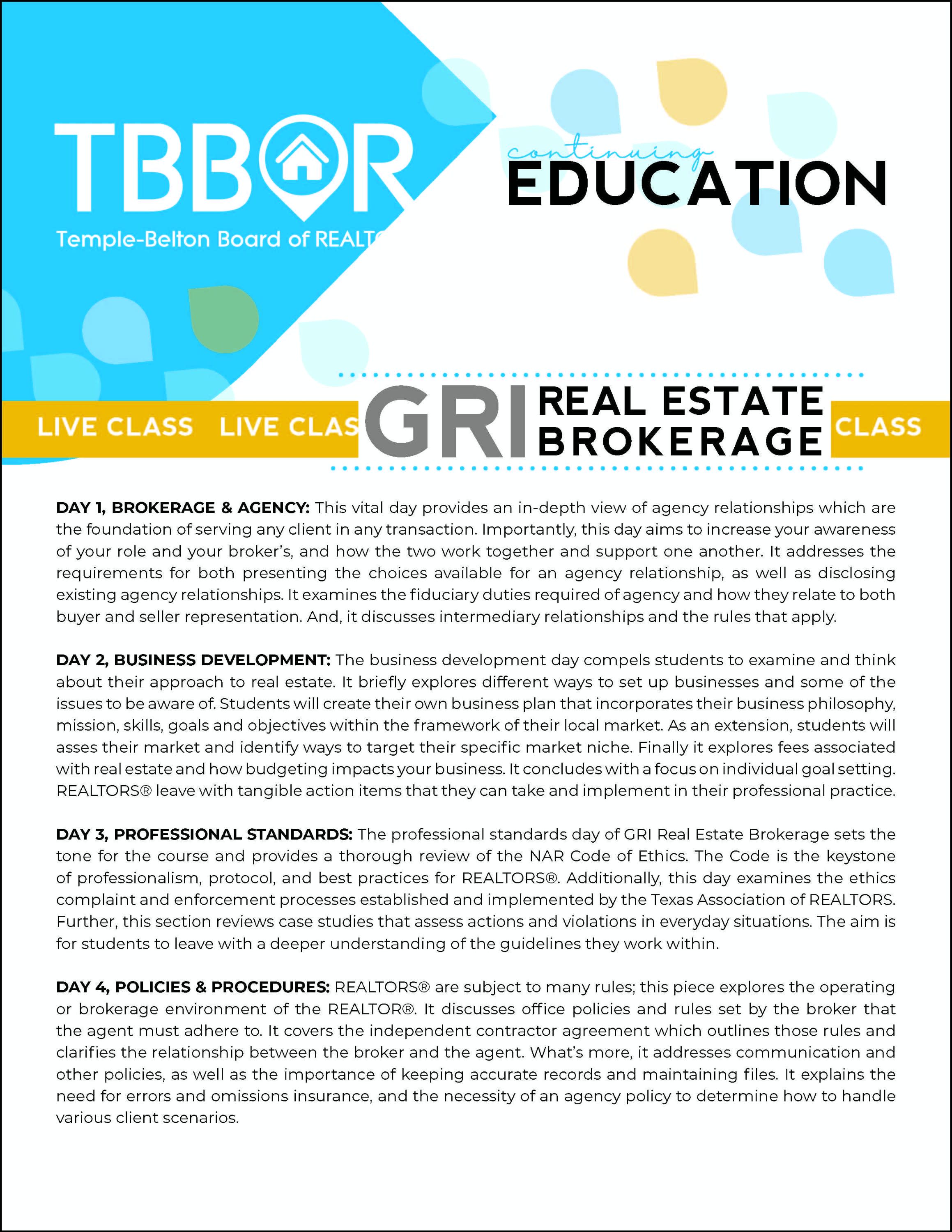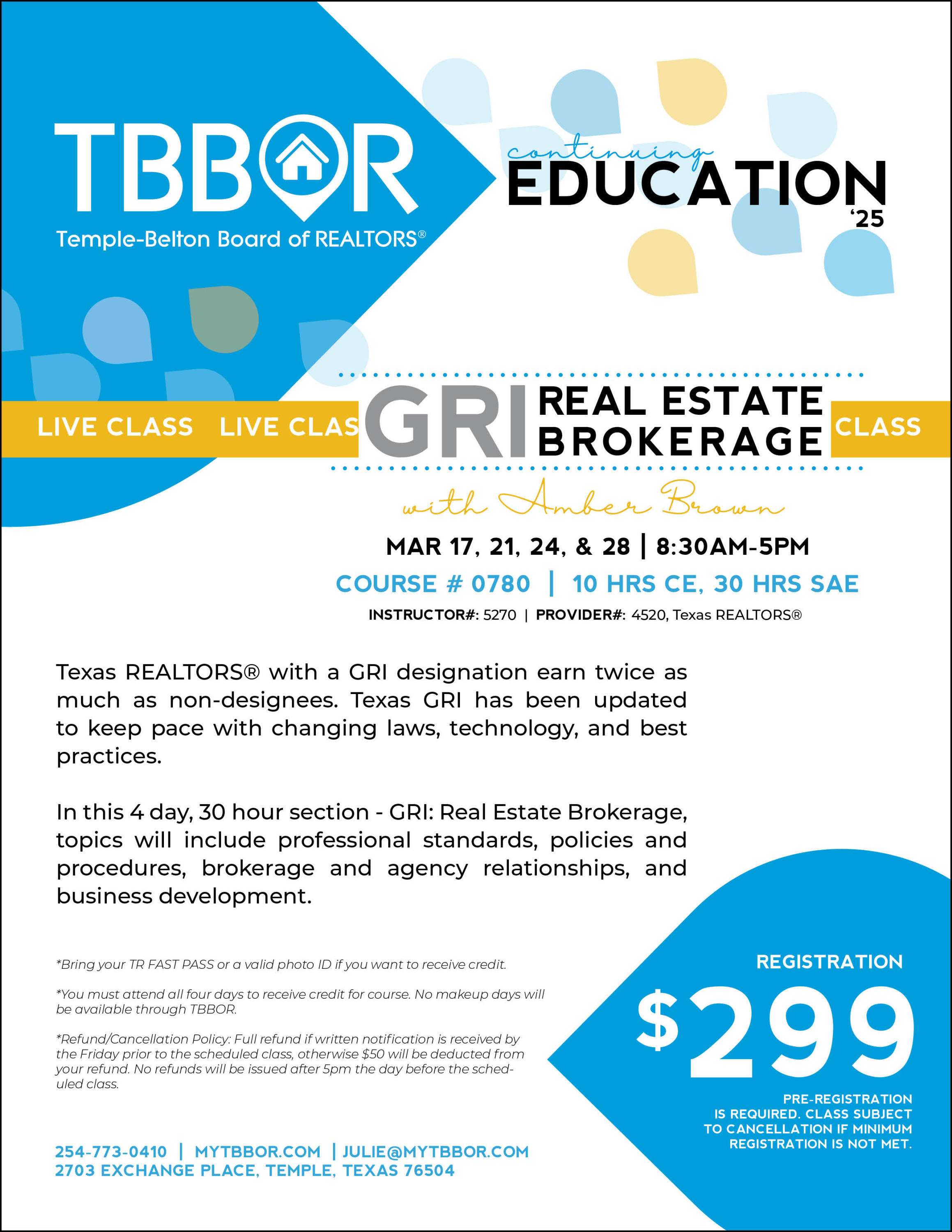 The GRI designation is a powerful tool to attract and build new business. You'll increase your skill level across the entire landscape of real estate with in-depth training in legal and regulatory issues, technology, professional standards, and the sales process. In this 30-hour section - GRI: Real Estate Brokerage, topics will include professional standards, policies and procedures, brokerage and agency relationships, and business development. Class dates (8:30am-5pm): 3/17, 3/21, 3/24 & 3/28; You must attend all four days to receive credit for this course.